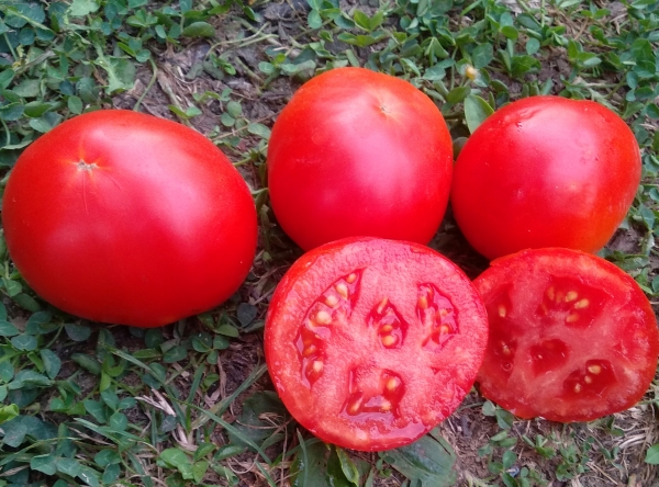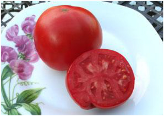 Плоды красные, округло-плоские, не жесткие, без трещин и пятен, пригодны для товарного производства. Вкусовые качества хорошие. Масса плодов 100 - 150 г. Сверхурожайный сорт среднего срока созревания. Кусты высотой до 50 см.