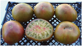 Плоды плоскоокруглые, розово-черного цвета. На вкус очень приятные, сладковатые, с фруктовым ароматом. Масса плодов 200 - 600 г. Цвет плодов и структура мякоти немного напоминает сорт Black Pineapple. Кусты высотой 1,5 м. Урожайный сорт среднего срока созревания.