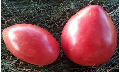Плоды розовые, удлиненные сердцевидные, вкусные, сладкие, не трескаются. Масса плодов 150 - 450 г. Высокоурожайный, среднерослый, средне-ранний сорт. Кусты высотой до 1 м.