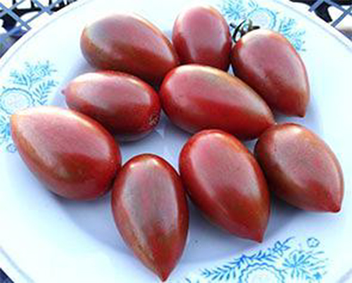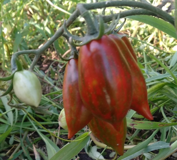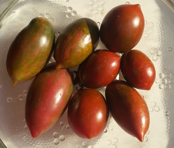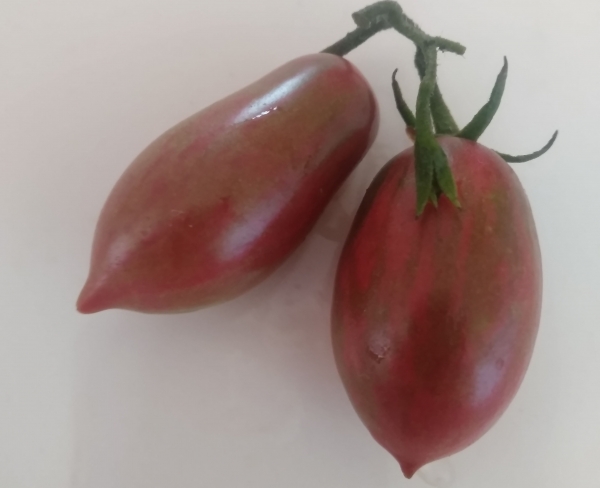 Плоды удлиненные, коричневые с зелеными плечиками. Обладают очень хорошими вкусовыми качествами, со сладостью и небольшой терпкостью. Масса плодов 15-30 г. С удовольствием съедаются прямо с куста и отлично подходят для консервирования. Ранний, высокоурожайный сорт длительного плодоношения. В открытом грунте цветет, завязывает плоды и плодоносит до заморозков. Хорошая завязываемость множества кистей на кусте, и плодов в кистях. Сброса цветков и подгорания плодов в жару не замечено. Высота кустов в открытом грунте к середине сентября достигает 2,5 м. Растения сильнорослые, с хорошей подвязкой можно выращивать в 2-4 ствола. Сорт имеет повышенную устойчивость к заболеваниям. Без проблем растет в теплице.
