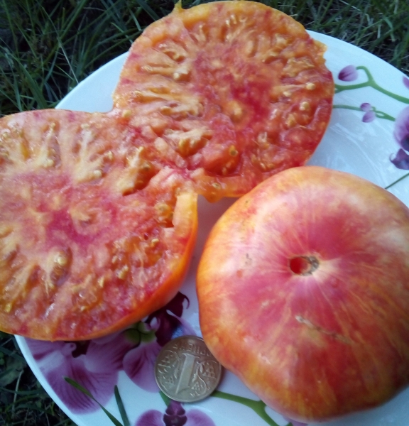 Новинка селекции от Фреда Хемпеля, США. Плоды красно-оранжевые, плоскоокруглые, с небольшими ребрышками, мясистые, многокамерные, сочные, превосходные на вкус, с отличным ароматом. Масса плодов 250 - 400 г. Урожайный сорт среднего срока созревания. Кусты высотой до 1,5 м.