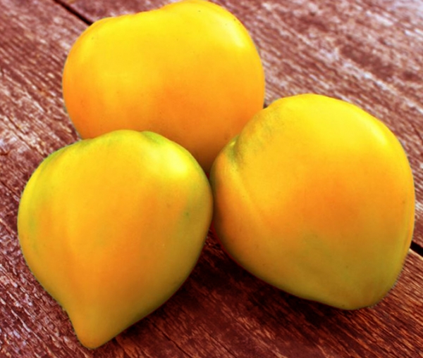 Плоды жёлтые, удлиненной сердцевидной формы, мясистые, с кремовой мякотью, вкусные. Масса плодов 250 - 300 г. Среднеспелый сорт. Кусты высотой около 1,5 м.