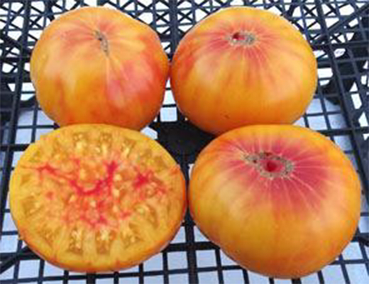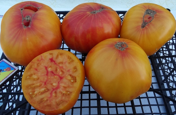 Семейная реликвия из Кентукки (США). Плоды оранжево-красные, очень плотные, мясистые, многокамерные, с небольшим количеством семян. Мякоть оранжево-красная, мраморная, сочная. Вкус превосходный, сладкие. Масса плодов 200 - 500 г. Высокоурожайный среднеспелый сорт. Кусты высотой до 1,5 м.
