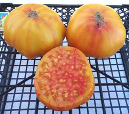 Плоды красно-оранжевые, округло-плоские, с небольшими ребрышками у плодоножки, очень плотные, мясистые, многокамерные, достаточно сочные. Мякоть мраморная, сладкая, отличная на вкус, с приятным ароматом. Масса плодов 280 - 900 г и более, в среднем 400 - 600 г. Высокоурожайный среднеспелый сорт, устойчив к заболеваниям. Кусты высотой до 1,8 м, с темно-зелеными листьями обычного типа.