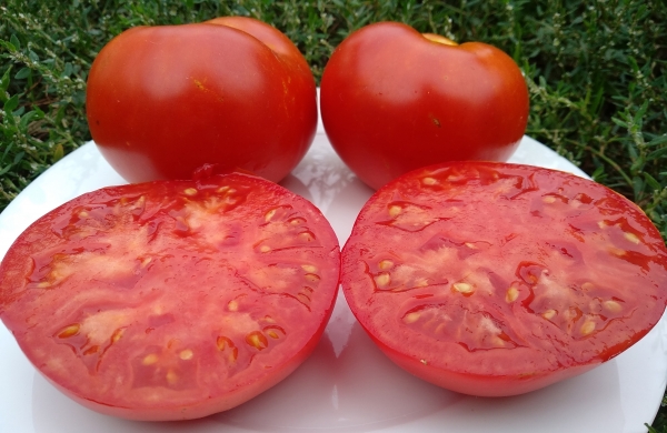 Плоды красные с оранжевым оттенком, плоско-округлые, плотные, мясистые, достаточно сочные, без трещин, с хорошей лежкостью. Масса плодов 270 - 500 г и более. Вкус богатый, хорошо сбалансированный. Сорт высокоурожайный, среднеспелый, с повышенной устойчивостью к заболеваниям. Листья обыкновенные. Кусты высотой до 1,5 м.