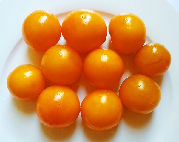 Очень ранний, низкорослый, высокоурожайный сорт для открытого грунта. Кусты аккуратные, штамбовые, высотой 0,5 - 0,6 м, не нуждаются в подвязке и пасынковании, густо усыпаны плодами. Плоды успевают созревать в открытом грунте в условиях короткого лета. Плоды желто-оранжевые, круглые. Масса плодов 50 - 60 г. В спелых плодах повышенное содержание сахара и β-каротина. Томаты вкусны в свежем виде, а также прекрасно подходят для консервирования. При засухе возле плодоножки могут образоваться трещинки, которые засыхают и не влияют на лежкость плодов.