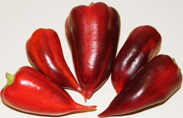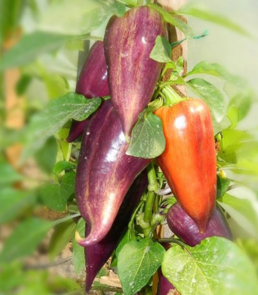 Плоды конусовидные, с хвостиком, не крупные, с толстыми стенками. В технической спелости плоды выглядят экзотично: на золотисто-желтом фоне сиренево-фиолетовые полосы. При полном созревании плоды становятся красными с антоциановым румянцем. Мякоть сочная, хрустящая, сладкая. Высокоурожайный раннеспелый сорт, устойчив к вирусным заболеваниям и перепадам температур. Растения компактные, высотой 30 - 40 см.