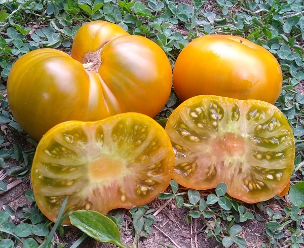 Сорт впервые был представлен миру в 2014 году, получен от скрещивания сортов Golden Dwarf Champion и Cherokee Chocolate. Плоды зеленовато-желтые снаружи, с ярко зеленой мякотью, плоско-округлые, вкусный, с необычной сладостью, очень ароматные. Масса плодов 170 - 300 г, средняя масса - 200 - 250 г. Ранний урожайный сорт с длинным периодом плодоношения, обладает высокой болезнестойкостью, достаточно нетребовательный. Растения можно выращивать в контейнерах. В теплицах высота кустов может достигать до 1, 2 м, в открытом грунте - до 1 м, в емкостях от 10 л - до 80 см. Листья морщинистые.