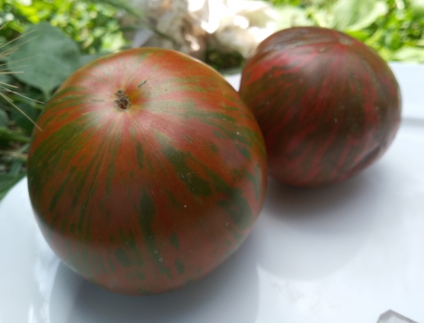 (США) Сорт Тома Вагнера. Плоды плоско-округлые, шоколадно-вишневые с зелеными штрихами, мясистые, вкусные, ароматные. Масса плодов 200 - 350 г. Мякоть красная. Урожайный среднеспелый сорт с растянутым плодоношением. Высота кустов в открытом грунте около 1,5 м, в теплице - около 1,8 м.