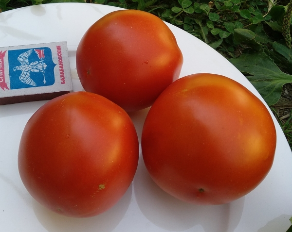 Плоды плотные, красные, круглые, одного размера, отличные на вкус. Масса плода 150 - 300 г. Плоды хорошо хранятся. Суперурожайный, надежный, неприхотливый, раннеспелый сорт. Кусты высотой 0,7 - 1,0 м, хорошо облиственные. Урожай гарантирован в любую погоду.