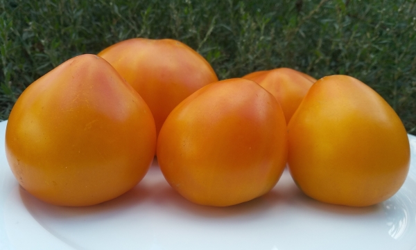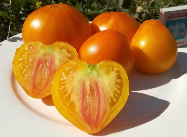 Плоды насыщенного желто-оранжевого цвета, округлые или округло-сердцевидные. Масса плодов – 250 - 600 г. Мякоть желтая, иногда с розовыми прожилками, сочная, с легкой кислинкой. Тонкая, но прочная кожица предохраняет плоды от растрескивания. Плоды содержат повышенное количество бета-каротина и витамина С. Плоды формируются в кистях по 4 - 6 штук. Урожайный среднеспелый сорт. Кусты мощные, высотой до 2 м и более.