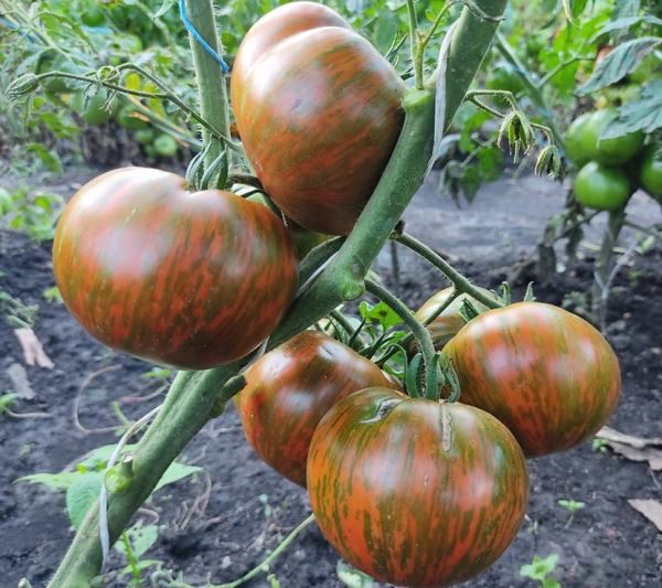 Плоды тёмные красно-коричневые, покрыты зелёными серебристыми полосками, сладкие и сочные. Масса плодов 300 - 500 г. Мякоть малиновая, очень вкусная. Урожайный, среднеспелый сорт с длительным периодом плодоношение и устойчивостью к заболеваниям. Кусты высотой 1,8 - 2 м.