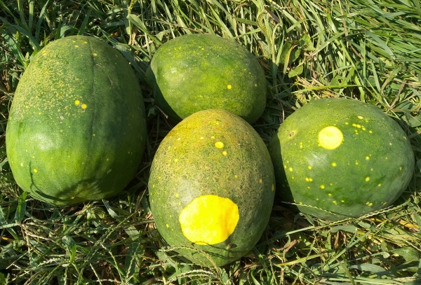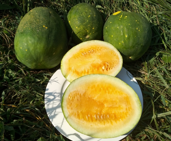Очень урожайный сорт средне-раннего срока созревания. Поверхность плодов темно-зеленая с желтыми пятнами. Масса их до 9 - 10 кг. Мякоть оранжевая, нежная, тающая, сладкая, вкусная. Все растение в желтых пятнах - и плоды, и листья.