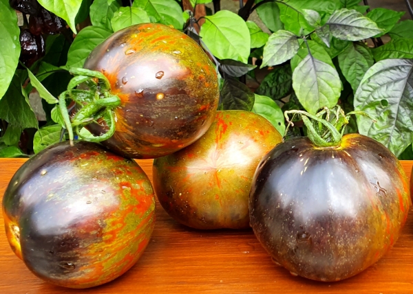 (США) Плоды круглые, кирпично-красного цвета с фиолетовыми, золотистыми и оливковыми штрихами. Мякоть красная с зелеными пятнами, сладкая. Масса плодов 150 - 200 г. Высокоурожайный, среднерослый, среднеспелый сорт. Кусты высотой до 1,5 м.