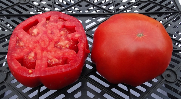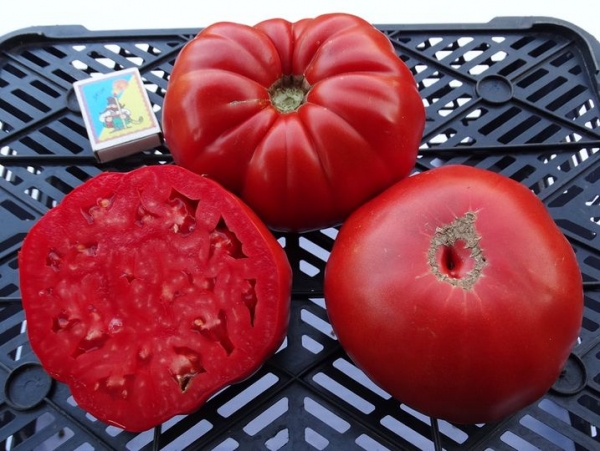 (Италия) Плоды плоско-округлые, слегка ребристые, насыщенного красного цвета, с глянцевой поверхностью, мясистые, малосеменные. Мякоть красная, с малым количеством сока, сладкая на вкус, с сильным томатным ароматом. В Италии этот сорт считается рекордсменом по размеру плодов. Масса их - 400 - 700 г, отдельные до 1,2 кг или даже до 2 кг. Все плоды - одномерные гиганты, мелких плодов нет. Кусты мощные, густые, с толстым стеблями высотой до 1,8 м. Высокоурожайный среднеспелый сорт.