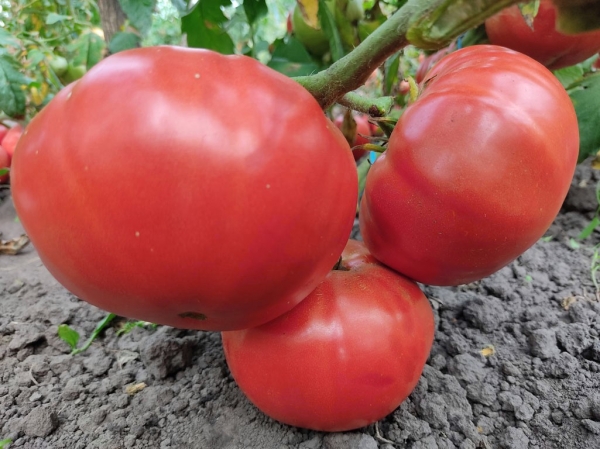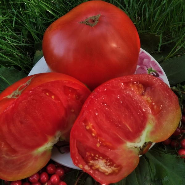 Новинка! Плоды плоско-округлые, красные, мясистые, малосеменные, упругие на ощупь, без трещин. Мякоть плотная с отличным ароматом и слегка кисловатая на вкус. Масса плодов 400 - 800 г и более. Очень урожайный, среднеспелый сорт. Кусты высотой до 1,5 м и более, с толстыми стеблями, сильно облиственные. Этот сорт один из первых по урожайности среди сортов гигантов.