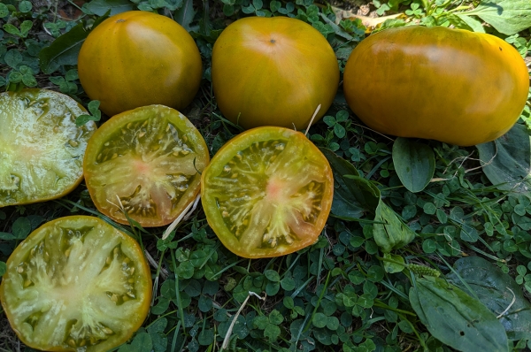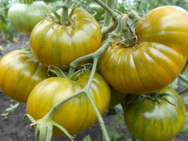 Плоды зеленого цвета, плоско-округлые, с характерными складками у плодоножки, плотные, очень сладкие, без кислоты. Масса плодов 150 - 350 г. Очень высокоурожайный ранний сорт. Кусты крепкие, не раскидистые, высотой 1,2 - 1,5 м.