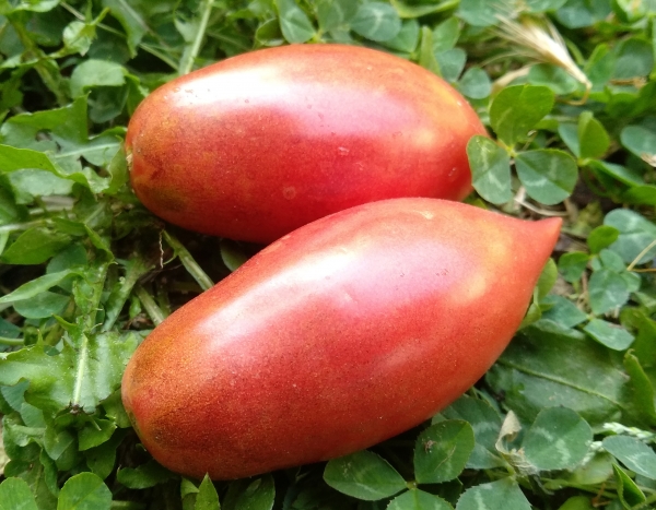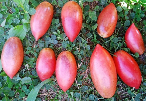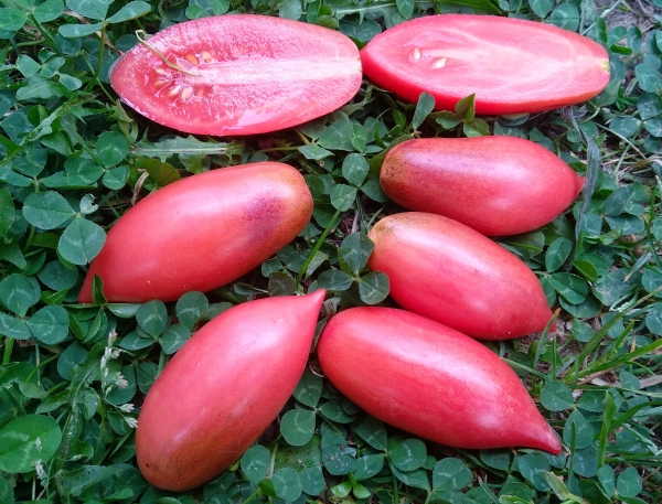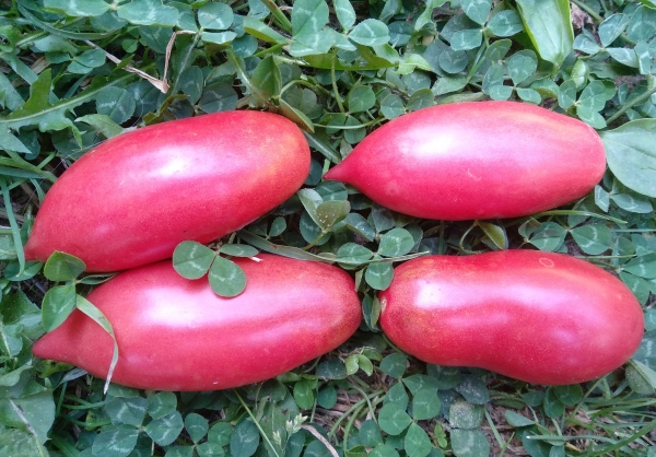 Новинка! Вариант с плодами розового цвета с небольшим фиолетовым напылением, удлиненные, с острым носиком, сладкие, вкусные, не трескаются, хорошо хранятся. Масса плодов 50 - 80 г. Мякоть розовая, плотная. Сорт устойчив к перепадам температур. Отлично подходит для консервирования. Очень урожайный раннеспелый сорт. Кусты высотой 1,8 м.