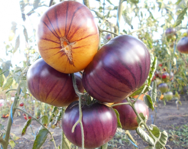 Новинка! Новый сорт, появившийся от скрещивания White Wonder и Baby Blue, селекции Роланда Буланже, Sart-Eustache, Бельгия. Плоды плоскоокруглые, светло-кремовые, с сине-фиолетовыми, антоциановыми плечиками и такими же полосами-мазками на боках, сочные, сладкие. Масса плодов 150 - 350 г. Рекомендованы для диетического питания, подойдут для аллергиков. Урожайный среднеспелый сорт. Кусты высотой 1,5 - 1,8 м.