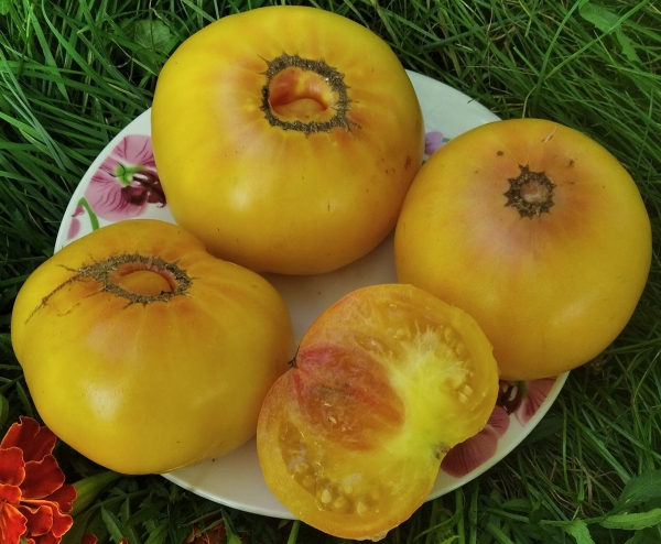 Новинка! Плоды плоскоокруглые, желтые с небольшой розовинкой на вершине, гладкие, мясистые, сочные, вкусные, сладкие. Масса плодов 300 - 400 г. Урожайный среднеспелый сорт, болезнеустойчивый. Кусты высотой до 1,5 м, с гофрированными картофельными листьями.