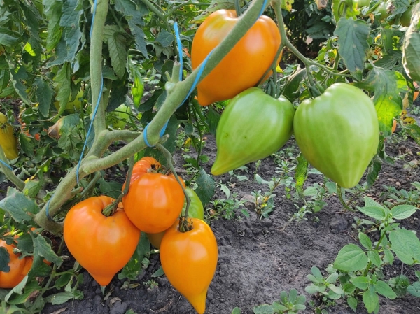 Новинка! Автор сорта селекционер Виталий Геннадьевич Алифиров, Казахстан. Плоды сердцевидные, оранжево-желтые, в меру плотные, не растрескиваются. Мякоть маслянистая, сладкая. Масса плодов 200 - 400 г, отдельные до 570 г. Плоды превосходны свежими и в салатах, подойдут для соусов, детского и диетического питания. Высокоурожайный среднеспелый сорт. Кусты высотой 1,6 - 1,8 м.