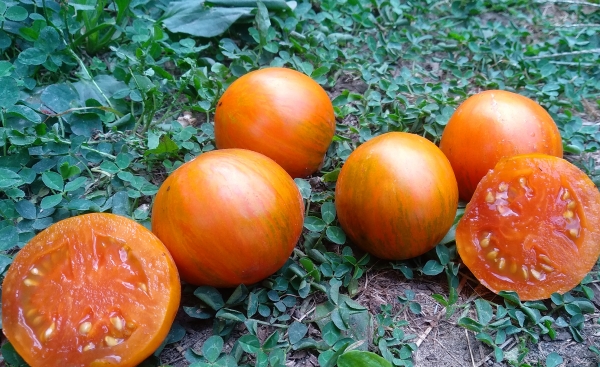 Новинка! Один из сортов линии "Kiwi", полученный скрещиванием "Dino Eggs" с F2 из линии «Lazy». Плоды оранжевого цвета с зелеными полосками, круглые, со сбалансированными вкусовыми качествами. Масса плодов 60 - 120 г. Урожайный среднеспелый сорт. Растения высотой до 1 м, с морщинистыми обычными листьями.