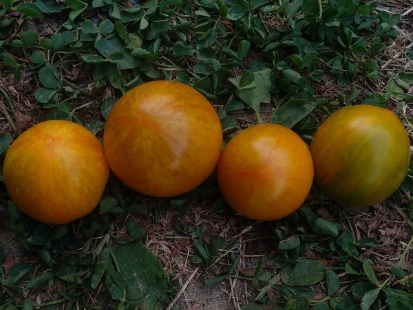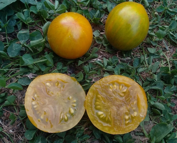 Новинка! Cорт из линии Киви, полученной путем скрещивания Dino Eggs с селекцией F2 от Lazy Family (Kangaroo Paw Brown F4 x Purple Russian), созданной Винсом Лавалло. Плоды круглые или слегка сердцевидные, желтого цвета с янтарными, светло-зелеными и оранжевыми полосками. Масса плодов 60 - 120 г. Мякоть желтого цвета, очень сочная, сладковатая на вкус. Высокоурожайный среднеранний сорт. Растения компактные, высотой до 1 м, с обычными морщинистыми листьями. Можно выращивать в больших горшках.
