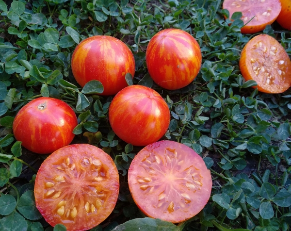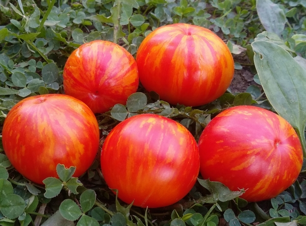 Новинка! (США) Селекция Блейна Хортона. Плоды округлые, красные, с золотыми полосками. Мякоть красная, вкусная, сочная. Масса плодов от 80 - 300 г. Высокоурожайный среднеспелый сорт, устойчив к заболеваниям. Растения компактные, высотой до 1 м, с широким листом.