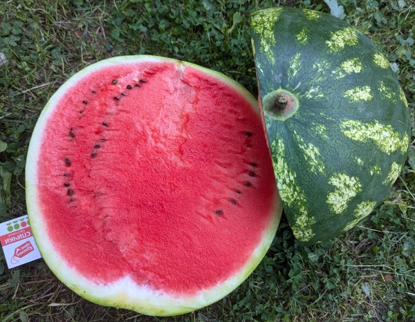 Новинка! Плоды имеют форму короткого эллипса, светло-зеленые с темно-зелеными полосами. Мякоть красного цвета, сочная, очень сладкая. Масса плодов 2,8 - 7 кг, могут вырастать до 16 кг. Плоды транспортабельные, могут довольно долго храниться. Растения имеют длинные плети, обладают мощной корневой системой. Высокоурожайный ранний сорт, устойчивый к неблагоприятным погодным условиям и жаре.