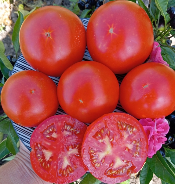 Новинка! Плоды красные, круглые, многокамерные, сладкие, с кислинкой, ароматные. Масса плодов 70 - 150 г. Мякоть ярко-малиновая. В кистях по 4 – 5 плодов. Ранний сорт. Кусты компактные, штамбовые, высотой до 50 см, с простыми крупными листьями.