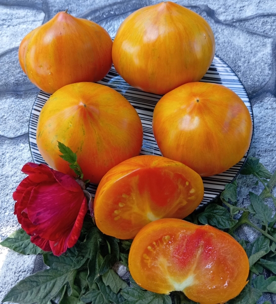 Новинка! Один из самых красивых сортов. Плоды сердцевидные с красно-розовыми и золотисто-желтыми полосками, с жемчужным блеском. Мякоть желтая с розовыми разводами, сочная, превосходная на вкус. Масса плодов 150 – 400 г. Урожайный среднеспелый сорт. Кусты высотой до 1,8 м.