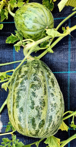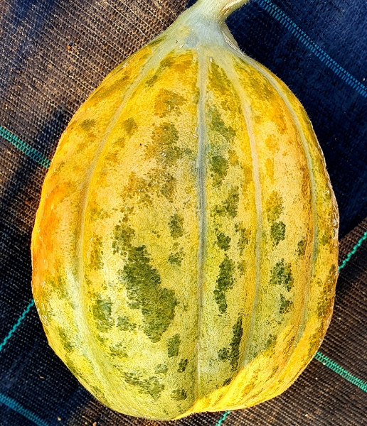 Плоды необычной формы: ребристые, сначала темно-зеленые (почти черные) с серебристыми вкраплениями, по мере созревания становятся желтые с оранжево-красными вкраплениями. Мякоть кремовая, очень ароматная, плотная, сладкая. Масса плодов 1 - 2 кг. Ранний засухоустойчивый сорт.